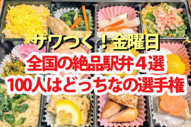 グルメ【ざわつく金曜日】人気No.1駅弁4選(仙台 金沢 名古屋 博多)100人はどっちなの選手権 2026年4月17日(金)放送の『ザワつく金曜日』100人はどっちなの選手権、日本全国駅弁オールスターSP。仙台が生んだ究極の炙り押し寿司、カニとノドグロと甘辛い絶品和牛、絶品&贅沢太巻き、豊後牛とコラボした豪華駅弁の4品を紹介します。観客... 2026.04.17グルメ