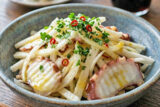 ①新じゃがいもは皮をむき、スライサーで細切りにする。たっぷりの水に5分間つけて、しっかりと水けをきる