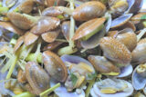 ①あさりは約3%の塩水に1時間つけて砂出しをし、殻をこすり合わせて洗い、水気をきる