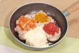 ②フライパンに水を入れて火にかけ、沸騰したら白菜のお新香の汁、鶏がらスープのもと、しめじ、えのき、木綿豆腐を入れ、柚子こしょうで味を調える
