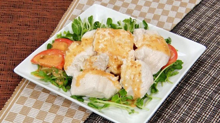 ④お皿に③を盛り付け、その上に鶏むね肉をのせ、【たれ】を混ぜ合わせてかければ出来上がり