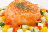 ⑤皿に器をひっくり返して盛り、余った③の野菜を周りに散らし、オリーブオイルとコショウをかけ、ディルを添えれば出来上がり