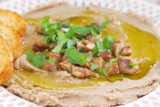 ②皿に①のフムスを平らに伸ばして盛り、たっぷりのオリーブオイルをかけ、刻んだ甘栗をのせ、パクチーを散らし、クミンをかければ出来上がり