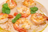 ④器に③のバナナソースを盛り、②の赤エビを並べ、ミントを散らし、オリーブオイルを回しかけ、チリパウダーをふれば出来上がり