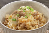 ③炊飯器の釜に浸水して水気を切った米と鶏がらスープ、残りのしょう油と酒、②のひき肉、玉ねぎ、ラー油を入れて氷をのせ、炊く