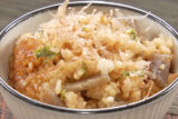 ⑤炊きあがったらレンコンを崩しながらよく混ぜて茶碗に盛り、お好みで青ネギを散らせば出来上がり