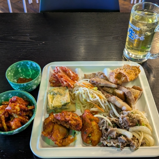 ランチタイムにはレバー(塩味)・豚ハツ(塩味)・豚モモ(塩味/タレ味)・ネックピートロ(ミソ味)・麹鶏(塩味)のお肉全6種類、そしてライス・オニオンサラダ・ワカメスープなどが食べ放題。