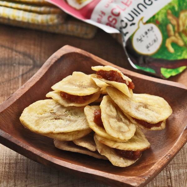 南国フルーツのジャムを挟んだバナナチップスです。