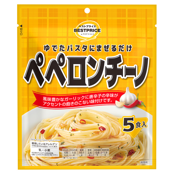 コストパフォーマンス1位:イオン トップバリュベストプライス ゆでたパスタにまぜるだけ ペペロンチーノ5食 321円