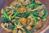 ③鍋に湯を沸かし、②のしめじをざるごと湯に入れてゆでる。しんなりとしてきたら湯をしっかりときり、熱いうちに①の浸し地に加える。同じ湯でしいたけを同様にゆで、熱いうちに浸し地に加える。さらに同じ湯で春菊もゆで、しんなりとしてきたらざるに上げて湯をきる。水で洗って水けを絞り、浸し地に加えて混ぜる。好みで赤とうがらしを加えて混ぜる