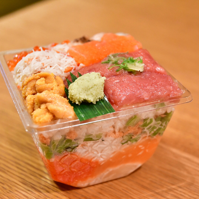 ご飯の下にはサーモン・たらこ・高菜を敷き詰め、きくらげ・鮭フレーク、その上に甘エビ・炙りサーモン・トロ・イクラ・カニ・うにをのせた贅沢な逸品。