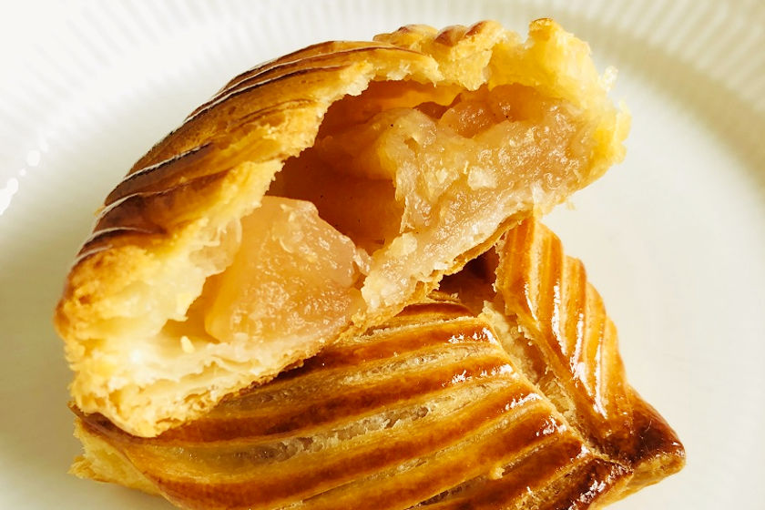 ポイントはパイ生地にフランスパンなど硬めのパンを作るための準強力粉を配合すること。