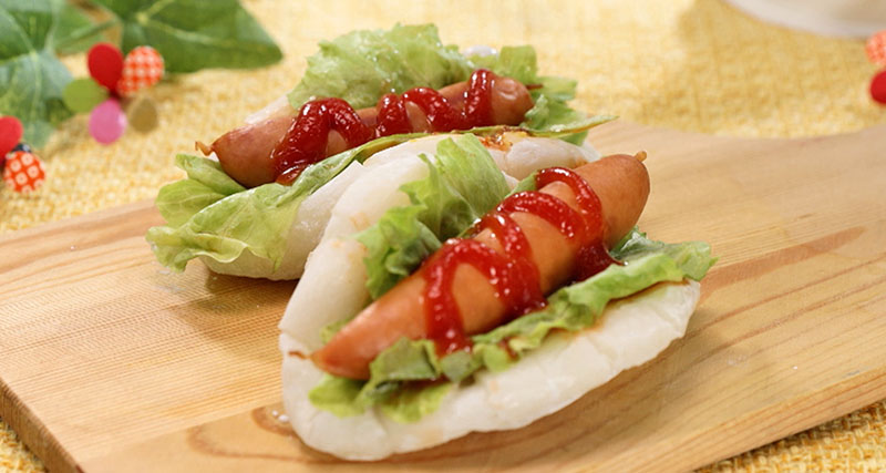 ③レタスをのせたお餅でソーセージをはさみ、お好みでマヨネーズ、ケチャップをかければ出来上がり